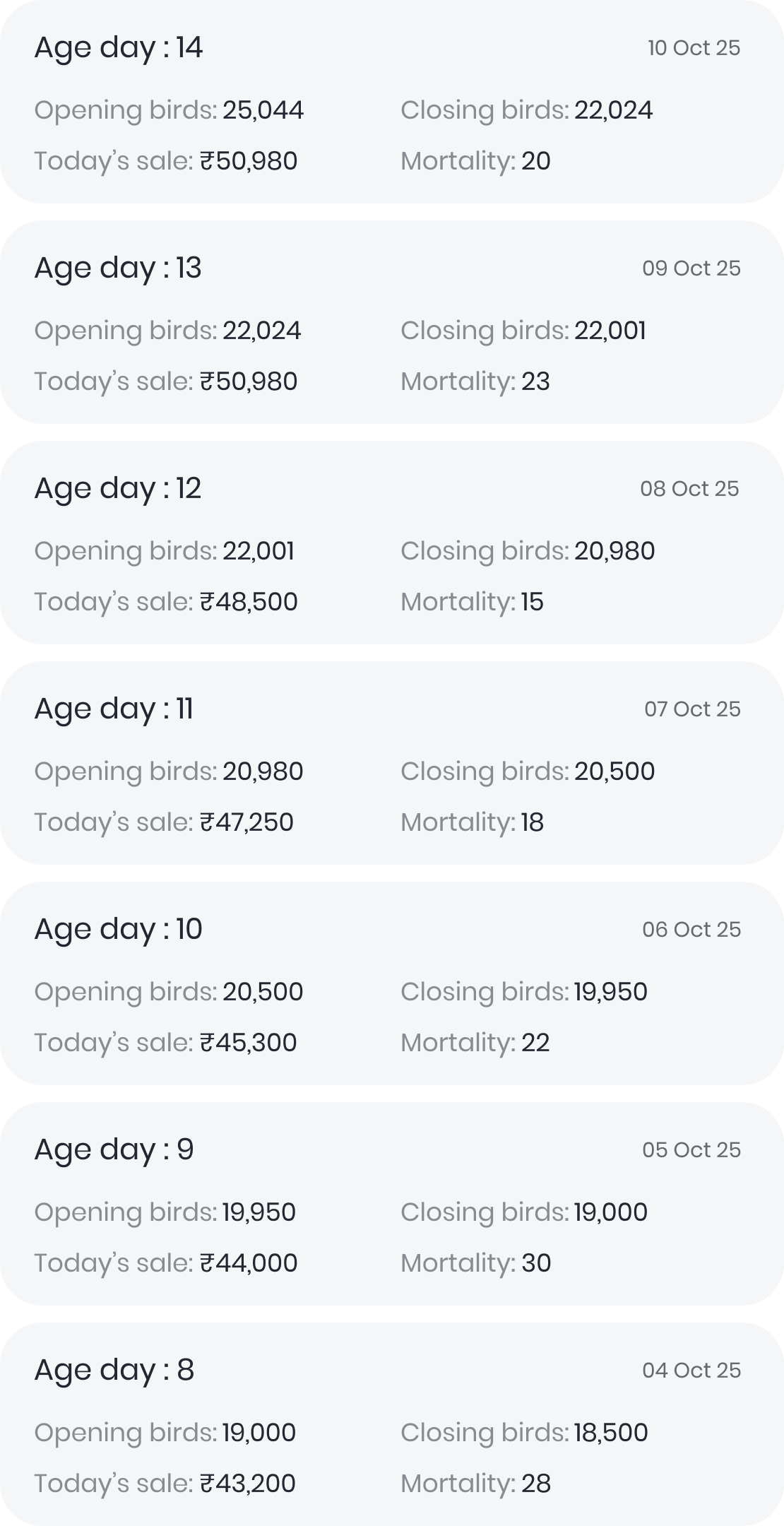 Record feed, egg counts, and farm activities in seconds — all from your phone.